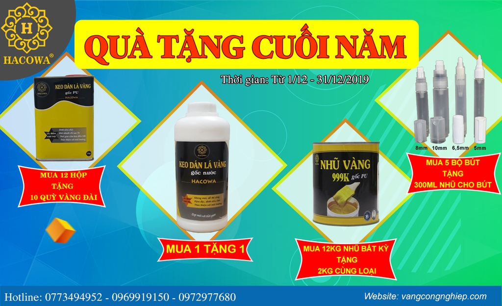 - Mua 12kg keo dán lá vàng gốc PU (350k/lít) sẽ được tặng ngay 10 quỳ vàng Đài Loan (trị giá 1.200.000đ)