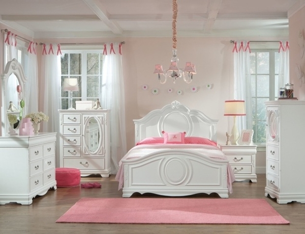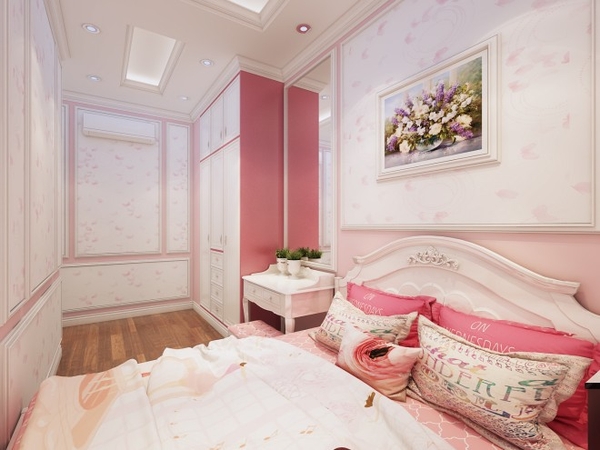 Về màu sắc: Các bé gái thường yêu thích những gam màu nhẹ nhàng, nữ tính và lãng mạn như hồng, kem. Đây cũng là màu rất phổ biến với chị em phụ nữ, đặc biệt là các bé yêu thời trang. Nội thất phòng ngủ ngập tràn sắc hồng sẽ tự nhiên tạo không khí vui vẻ, dễ chịu và ấm áp; phần nào ảnh hưởng đến việc hình thành tâm lý yêu đời, qua đó phát huy tính sáng tạo và tư duy tốt cho các bé. Việc sử dụng giấy dán tường hoa văn nhẹ nhàng màu hồng pastel chính là lựa chọn hàng đầu của các kiến trúc sư khi thiết kế. Ngoài ra, có thể sử dụng loại giấy dán tường có in các hình thù ngộ nghĩnh với gam màu hồng đậm, đỏ tươi…để làm điểm nhấn nổi bật không gian.