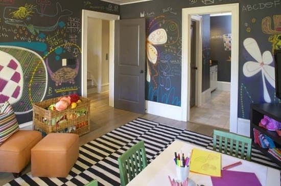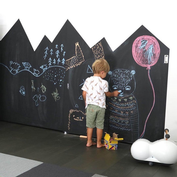 Trong phòng ngủ hoặc phòng giải trí cho các bé, bố mẹ có thể thiết kế cả một bức tường bảng đen hoặc thấp hơn để các con thỏa sức sáng tạo, vừa tiện lợi lại sạch sẽ. Khi con đến tuổi tới trường thì chính tấm bảng này sẽ là nơi ghi lại những con số, chữ viết để phục vụ công việc học tập của con.
