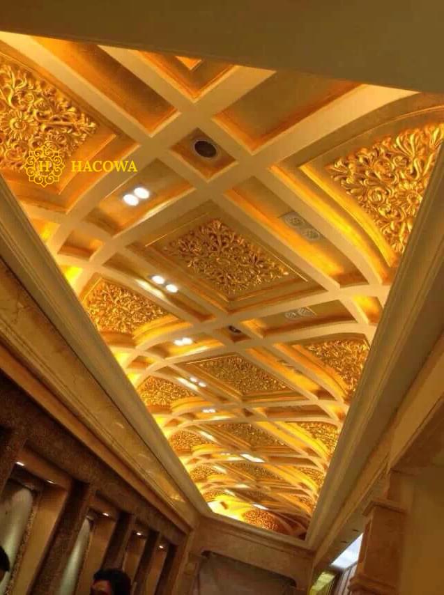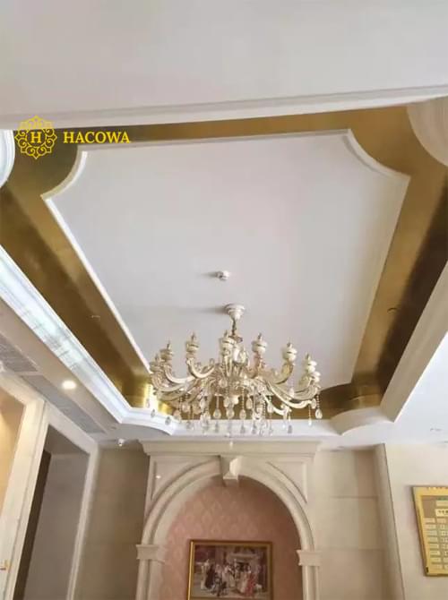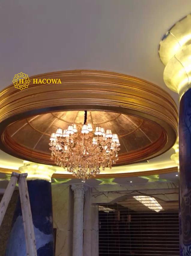 Tất cả các sản phẩm dát vàng của Hacowa bao gồm: phào chỉ PU PE, phào nẹp, các chi tiết phụ kiện trang trí phù điêu hoa góc… dát vàng theo ý muốn của khách hàng, họ thích chi tiết nào thì thực hiện chi tiết đó.