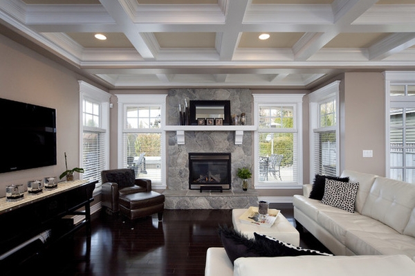 Với mô hình trang trí trần hộp điển hình ở Coffered handily này khiến không gian trở nên nổi bật. Bằng cách phối màu trắng với màu trung tính mềm mại, tô điểm mà không chế ngự toàn bộ không gian. Để có một cái nhìn hài hòa như vậy, bạn phải biết cách tô điểm, nhấn màu trắng trên một nền màu xám tối hơn.