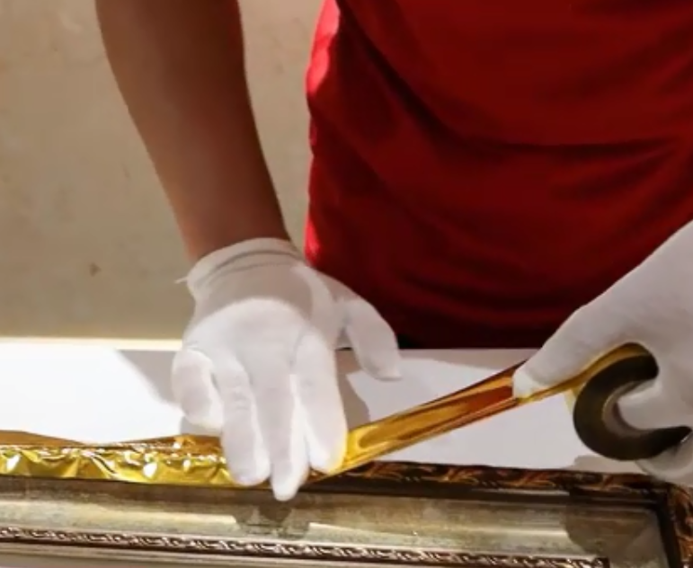 Bước 2: Dán vàng cuộn, miết cho vàng ăn vào toàn bộ keo