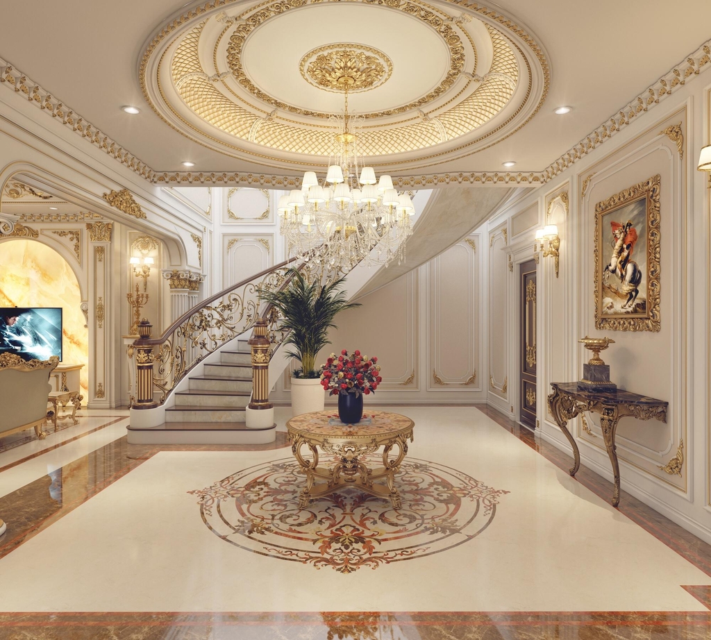 Với những phòng khách biệt thự theo phong cách tân cổ điển, chủ nhà thường làm trần thạch cao giật cấp kết hợp hệ thống phào chỉ, mâm trần trang trí càng làm cho không gian trở nên sang trọng và xa hoa.